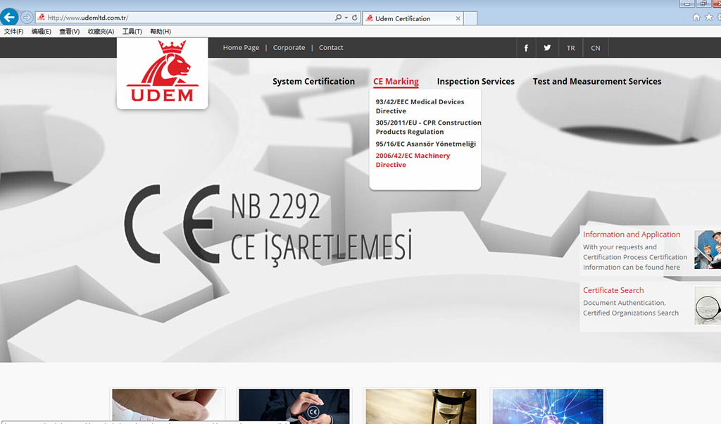 1. Please check the Certificate Company on the CE paper, open their official web (www.udemltd.com.tr). Find the “CE Marking”, choose 2006/42/EC Machinery Directive. You will see the “CERTIFICATE SEARCH” on the left.